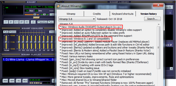 WASAPI其实在这十年以来早早就被Foobar 2000等各大专业播放器支持,但Winamp却到现在还没支持,可见它的衰败并不是没有缘由的。Winamp 5.8另一个更新是支持Win8.1、Win10系统,终于跟上了时代的步伐。除此以外,更新内容以修复Bug为主,并没有太多新鲜玩意儿。
