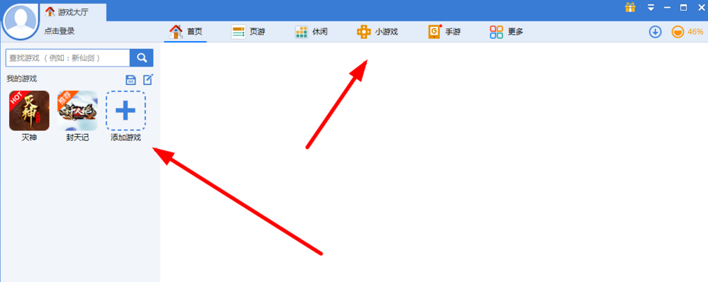 弹出新的界面,找到并点击“游戏大厅”,首次使用需要先进行添加,