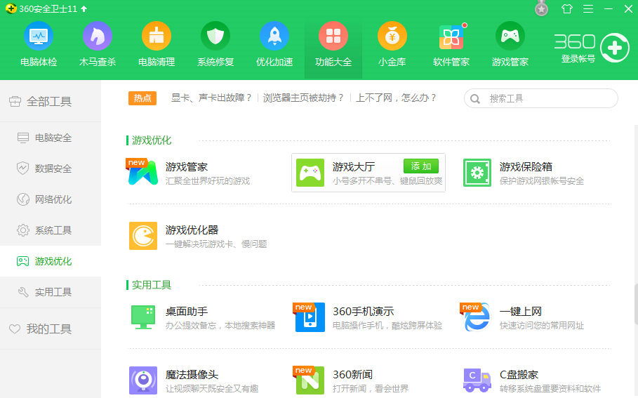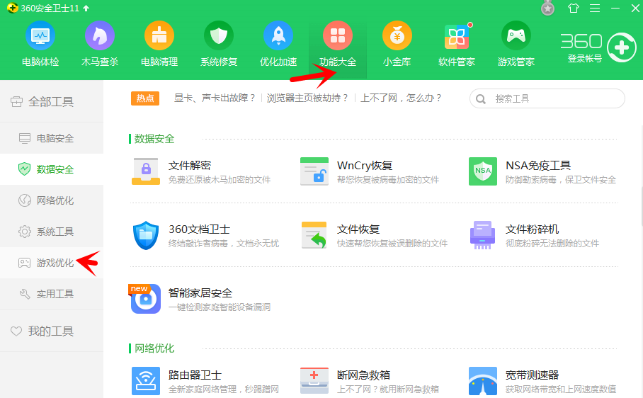 打开360安全卫士,进入界面,点击“功能大全”,再点击左侧的“游戏优化”,