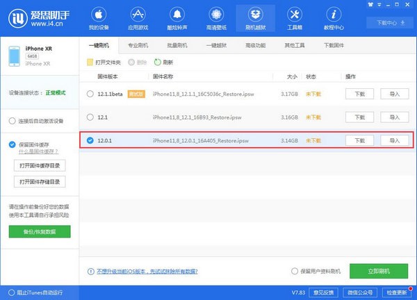 2、在可刷版本中选择您要刷的 iOS 版本,点“立即刷机”,之后爱思助手会自动帮您下载固件并刷机,切记,降级万不能选择保资料;