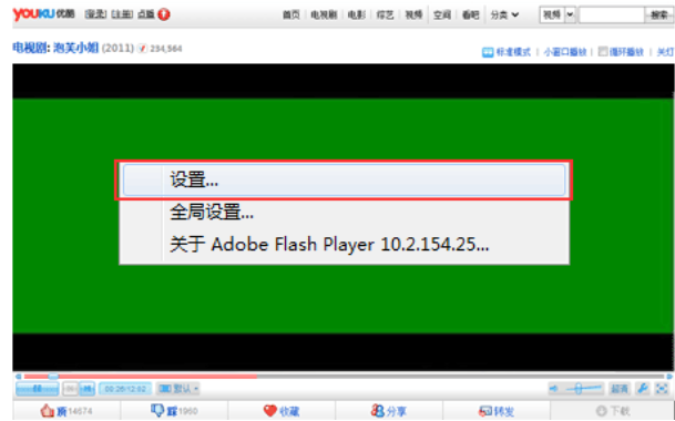 1、如图,用优酷播放视频时出现了绿屏现象,鼠标右键点击播放器,在弹出的菜单中点击【设置】。