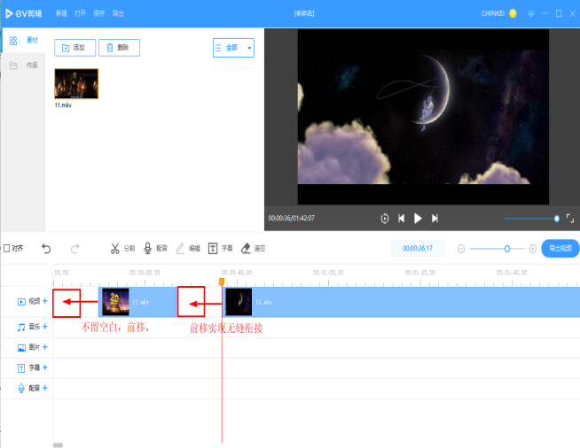 删除之后,轨道上就会出现空白,这时一定要拖动视频进行无缝衔接,轨道不留白、视频导出之后才没有黑屏,你可以按住【ctrl+enter】完整播放一遍,确定无误再导出。