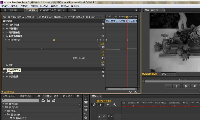 激活效果面板,找到视频效果:黑白,灰度系数校正,