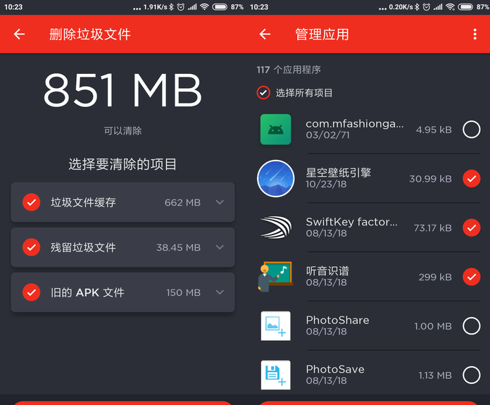 清除垃圾功能和批量卸载APP功能