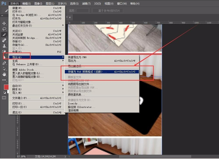 切片完成,将其导出,这时选择工具栏中的“文件”-“导出”-“存储为Web所用格式”,或快捷键ctrl+shift+alt+s,