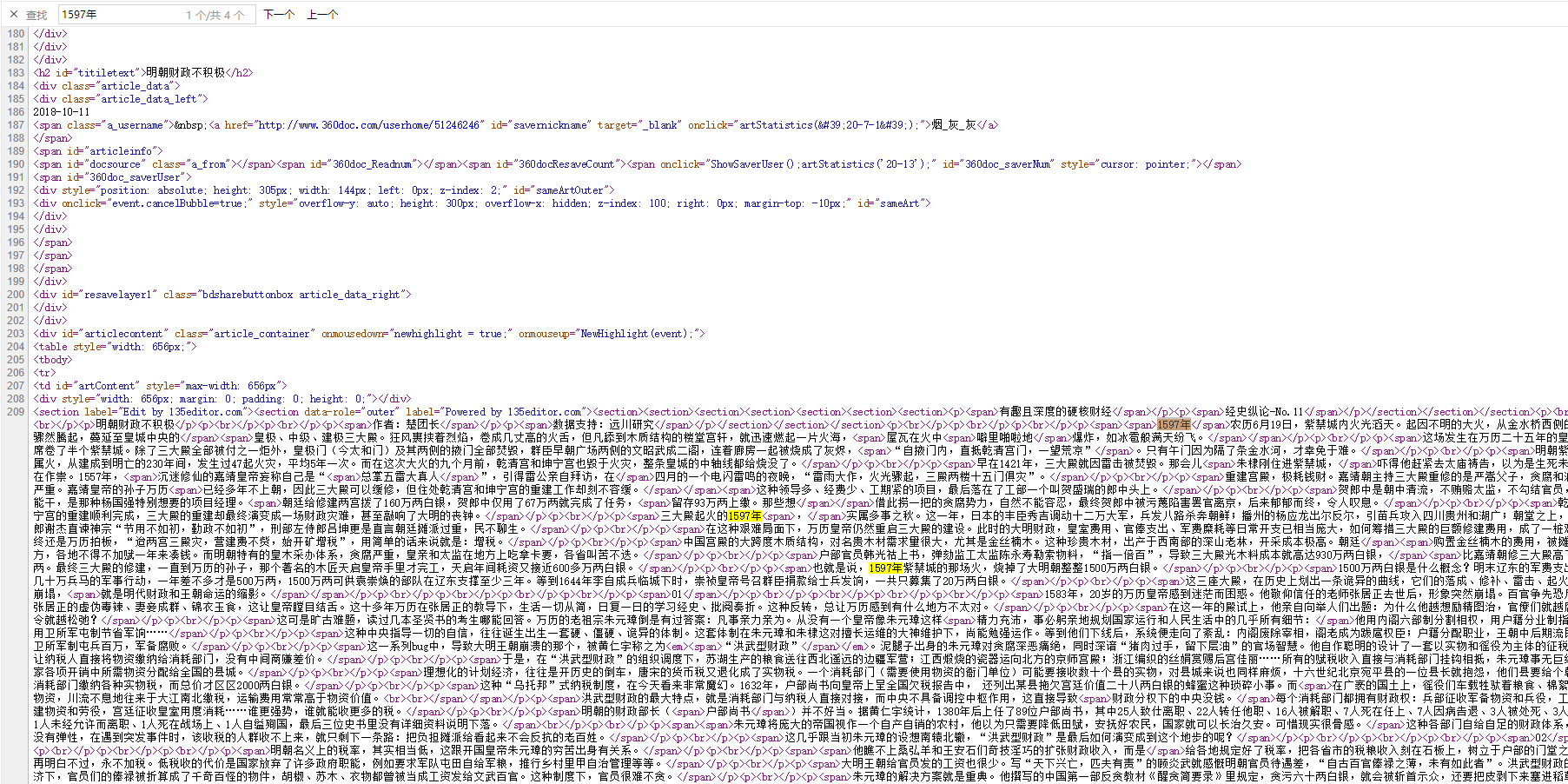 如果想要复制全部文本,先记住文本开头:“1597年......”,然后鼠标右击——查看网页源代码,在本网页代码中输入搜索开头文字;