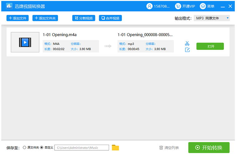 点击“转换”,开始转换音频格式,你会看到进度条显示,音频文件转换剪切成功之后会显示“打开”,