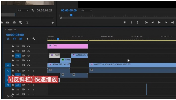 通常我们使用+/-号来缩放时间轴,但是你也可以使用反斜杠来进行快速缩放,只要按一下就可以缩放到整个序列的长度,再按一下就可以回到之前的状态,效率更高。另外,你可以按下Ctrl+反斜杠来隐藏顶部的项目信息,适用于电脑屏幕较小的情况。