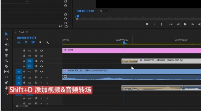 很多时候,我们需要为多个素材添加转场,使用鼠标并不方便、效率太低。按住Shift+D可以快速添加音频和视频的转场,如果你想单独为视频添加转场,可以按下Ctrl+D;如果你想为音频添加转场,可以按下Ctrl+Shift+D。