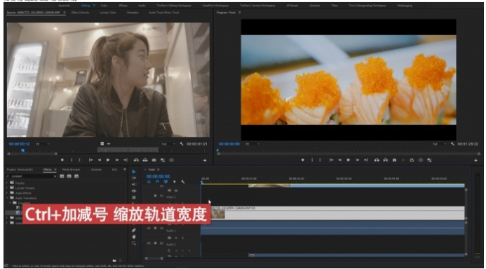 如果视频轨道太窄,通常大家会使用鼠标滚轮来放大相应的轨道,但是这样太浪费时间。其实你可以选择使用Ctrl+加减号来缩放单个轨道的宽度,如果你想一次性扩展或者缩小所有轨道,可以使用Shift+加减号。