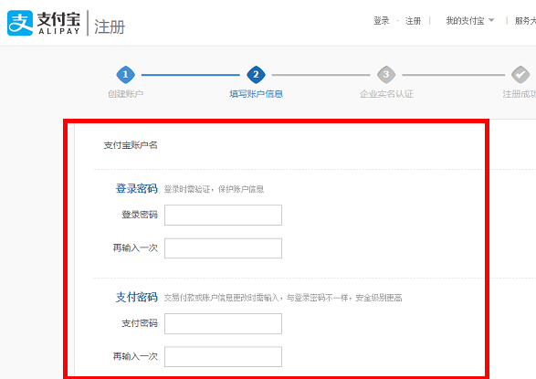 开始填写账户信息,输入企业账户登录密码、支付密码以及密保,如图,