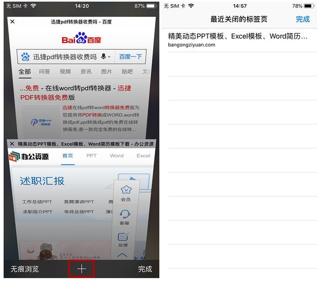 上网过程中不小心关闭了某个页面,怎么办呢?别着急,你只需要点击右下角的【标签切换】按钮,进入标签管理界面,然后长按【+】,就可以快速查看最近关闭的标签页了。