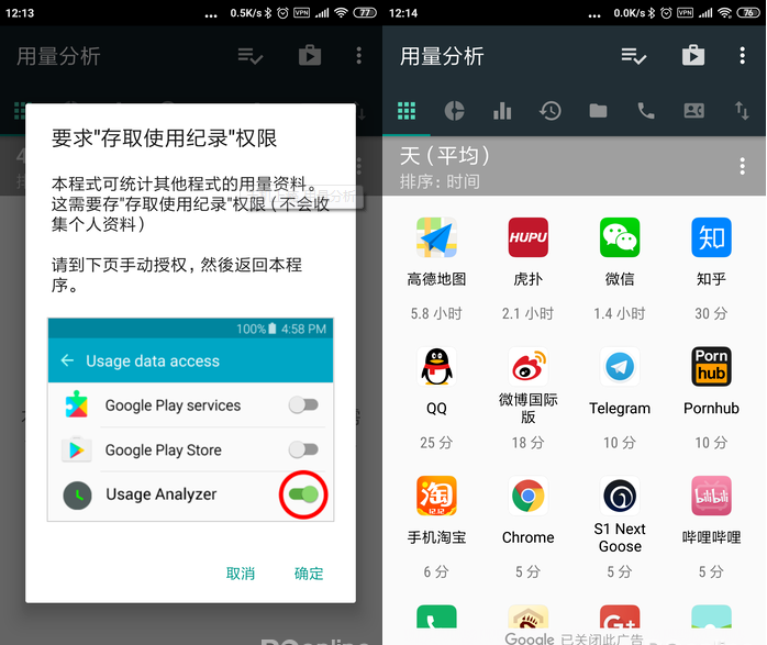 这款小工具的名字叫“用量分析”,顾名思义是用来查看APP的时长用量的。它来自国外,总体来看还是比较绿色的,但是免费版有广告,这会对体验造成一些负面影响。开启APP后,首先需要赋予存取使用纪录的权限,之后APP就会在主界面当中呈现出已安装的APP的使用时长了。