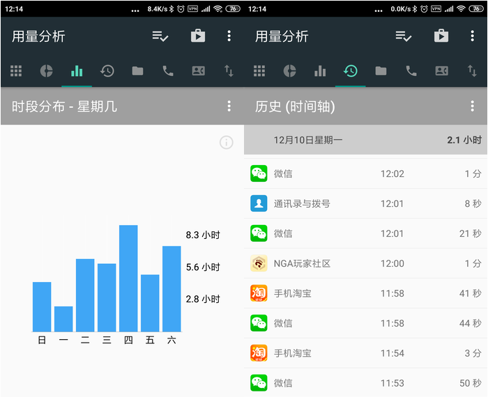 用量分析APP还可以查看使用APP的时间分布,例如在星期几使用手机的时间最长。如果看到工作日的用手机时间比休息日还多,那就得问问自己到底有没有划水摸鱼了。这款用量分析APP小工具还可以详细记录APP开启的时间,在什么时候开启什么APP用了多久,一目了然。如果看到列表当中总是被特定的APP刷屏,那对这APP上瘾的嫌疑就非常大了。