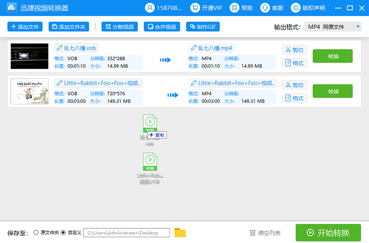 全部设置完成,点击界面右下角的“开始转换”,稍等片刻,VOB视频就成功转为MP4格式了。
