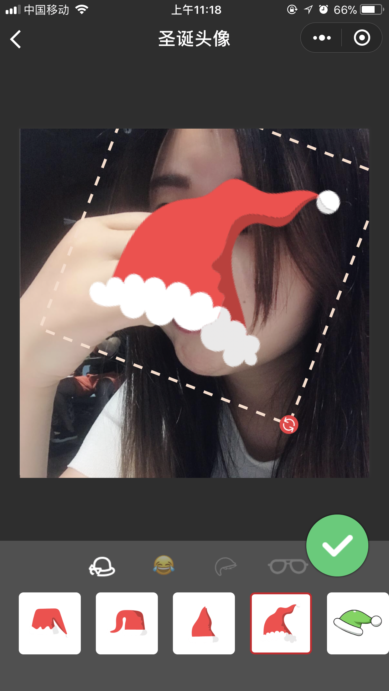 然后选择一个圣诞帽子的款式,选中圣诞帽子款式之后,你的头像上面就会出现一个很小的圣诞帽子,圣诞帽右下角有个如下图所示的手指和方向键组合的图标,直接拖拉移动到你想要的位置和大小,在大小和角度都没有问题之后,点右下角保存,就可以将制作完毕的微信圣诞帽头像保存到手机相册,圣诞帽微信头像就生成了。