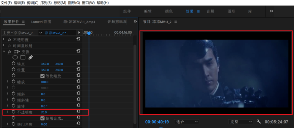 来到左侧的效果控件窗口,点击“不透明度”,调整它的参数值,