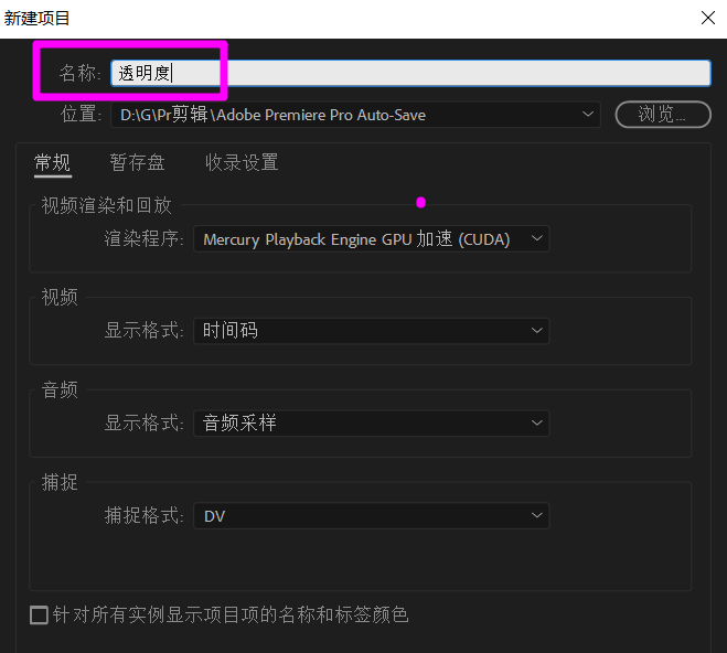 打开premiere软件,进入页面,点击【新建项目 】,将文档名称设为【透明度】,点击确定,