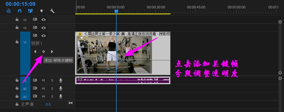 另外还可以点击左边的【添加关键帧】按钮,在透明度线上添加关键帧,拉动帧节点,分段调整关键帧的透明度。