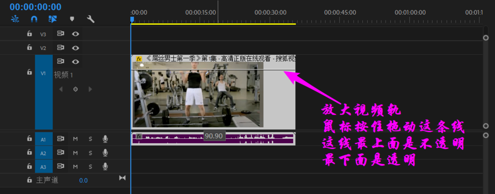 拖动两条视频轨中间的线,上调高度,将鼠标移动到上边沿就可以看到上下双箭头,按住鼠标向下拖动就可以看到透明度调节线,最上方是不透明,下方是越来越透明。