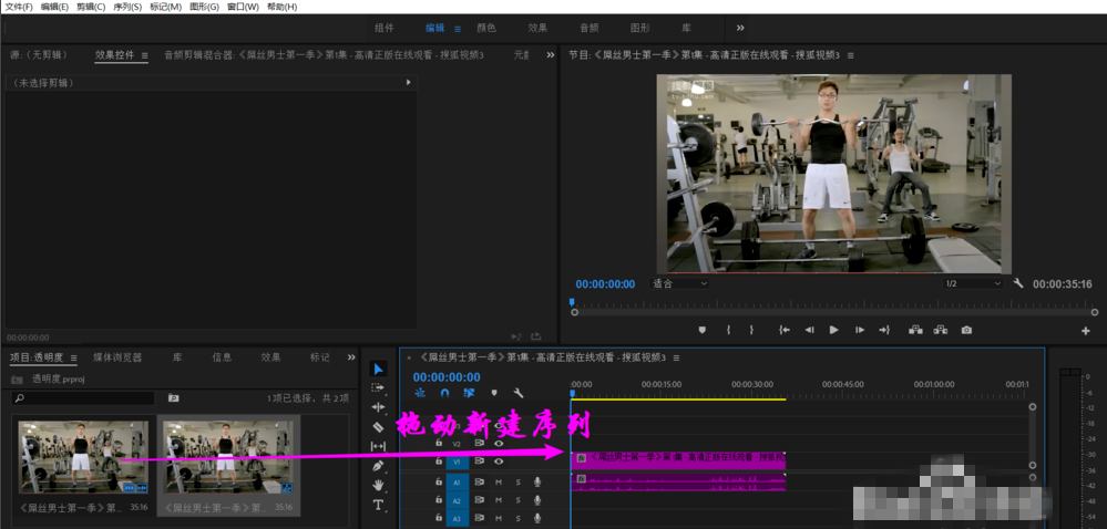 在项目面板中双击打开视频素材,将视频拖动到时间轴,新建序列,