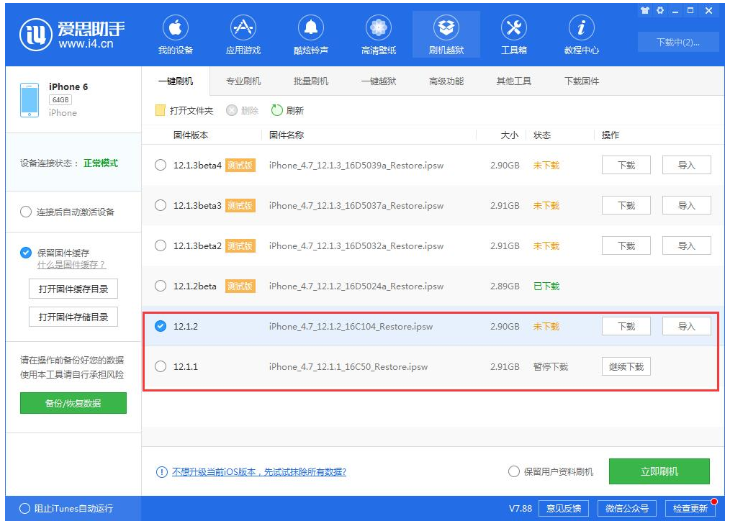 手机连脑电脑,打开PC爱思助手,选中可降版本,直接点击“立即刷机”即可。