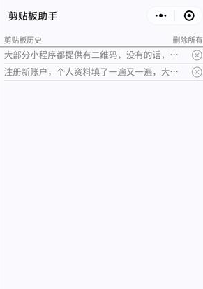 剪贴板助手是一个可以保存复制内容的小程序,我们平时玩手机经常会用到复制粘贴操作,一旦有新的内容覆盖、前面复制剪切的信息就不见了,这个小程序可以帮你保存剪贴板中的历史内容,不再丢失。