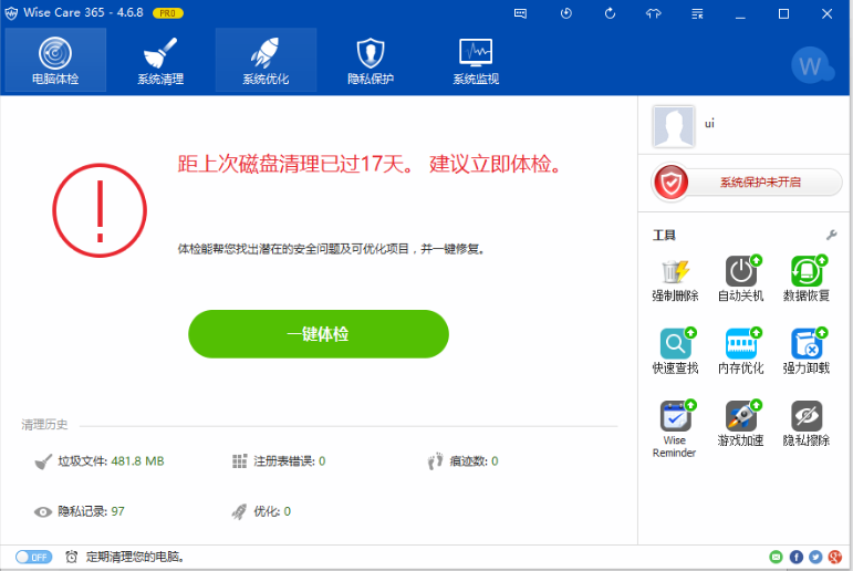 Wise Care 365被称为世界上最快的系统优化软件,支持电脑体检、系统清理、系统优化、隐私保护、系统监视等功能,此软件的扫描速度极快,可以在最短时间之内帮你进行系统清理!