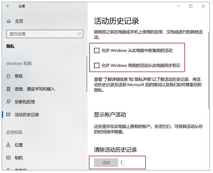 进入隐私设置界面,点击左侧的「活动历史记录」,取消勾选右侧的「允许Windows从此电脑中收集我的活动」、「允许Windows将我的活动从此电脑同步到云」,此外再点击「清除活动历时记录」,