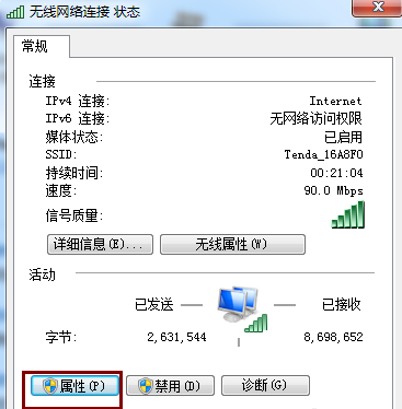 打开无线网路连接状态,点击【属性】,打开无线网络连接属性,