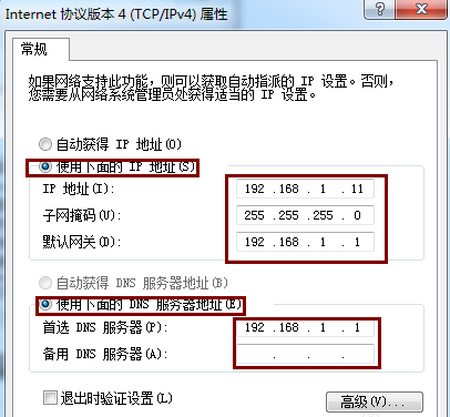 配置相应的静态ip和dns,ip地址在路由器分配的ip网段内,注意:不要填写已分配的ip,否则会ip冲突;网关填路由器的ip地址,dns填路由器的ip地址。