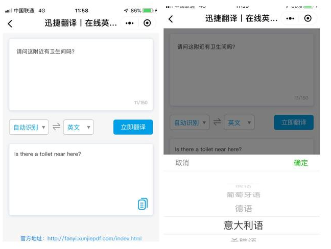 出国旅游,想问问卫生间在哪,但是你又不会讲英语、该如何开口呢?别急,拿出手机搜索微信小程序【迅捷翻译】,输入中文“请问这附近有卫生间吗”,它很快就能将其翻译成英文、德语、意大利语、法语、荷兰语等多国语言,堪称你的随身翻译助手。