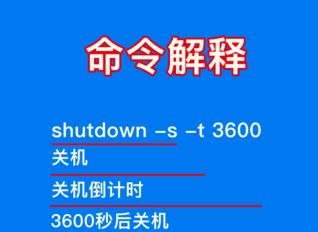 shutdown -s -t 3600命令的含义如下:shutdown -s表示关机,shutdown -s -t表示电脑关机倒计时,最后面的数字则表示倒计时时间,单位为秒。也就是说电脑将在3600秒后自动关机。