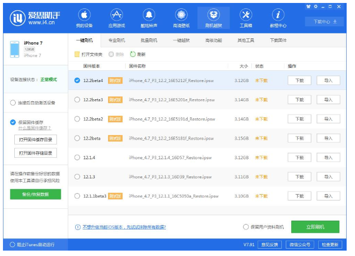 在可刷版本中选择您要刷的iOS版本,点“立即刷机”,爱思助手会自动下载固件并刷机;