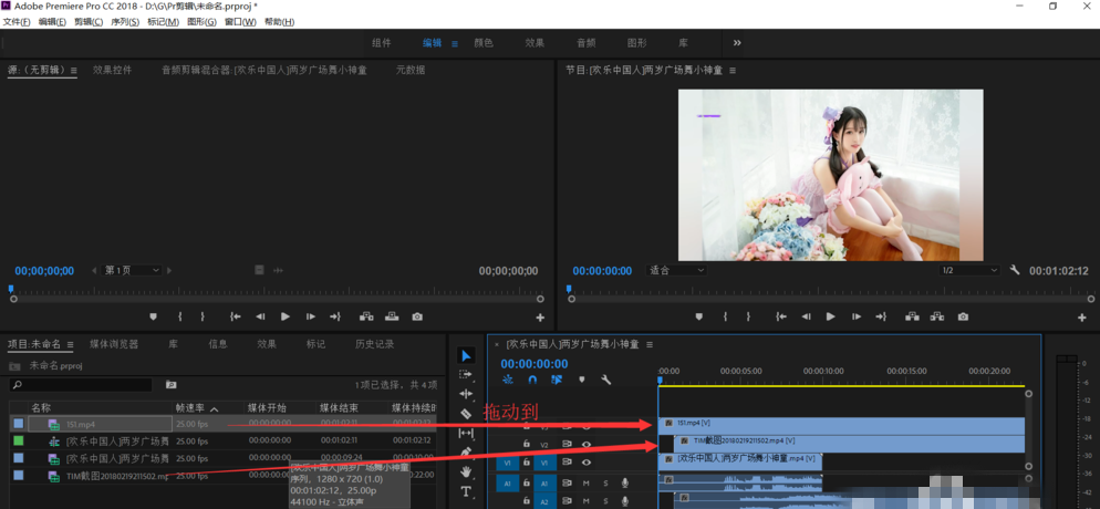 选中一个视频,将其拖动到右下方的新建项图标,以此新建一个序列,然后将另外的视频拖入时间轨道,