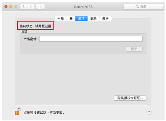 1、在Mac系统中安装Tuxera NTFS for Mac正式版,启动软件,点击到【激活】界面,软件当前状态为“试用版过期”,