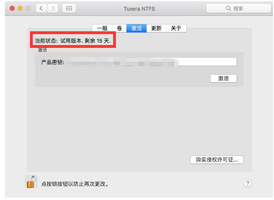 打开Tuxera NTFS For Mac,进入界面,点击“激活”选项,你可以看到当前状态是“产品密钥生效”,“未激活”按钮是灰色的,点击界面下方的小锁按钮,