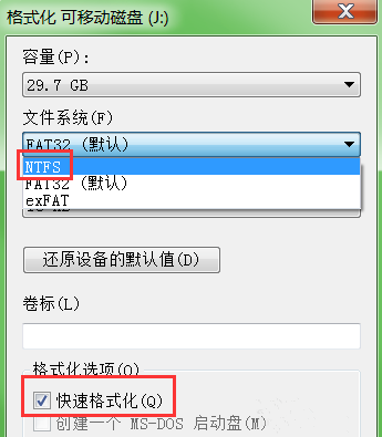 然后设置配置选项,选择NTFS格式,该格式支持大文件,勾选【快速格式化】选项,