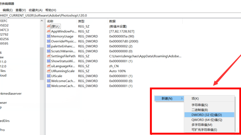 这时会弹出注册表编辑器,输入路径:HKEY_CURRENT_USER\\Software\\Adobe\\Photoshop\\120.0,找到Photoshop文件夹并打开,