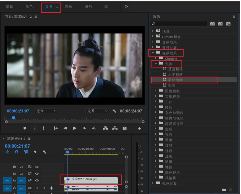 选中视频轨道,点击上方栏的【效果】,在右侧点击【视频效果】——【变换】,双击【羽化边缘】选项,
