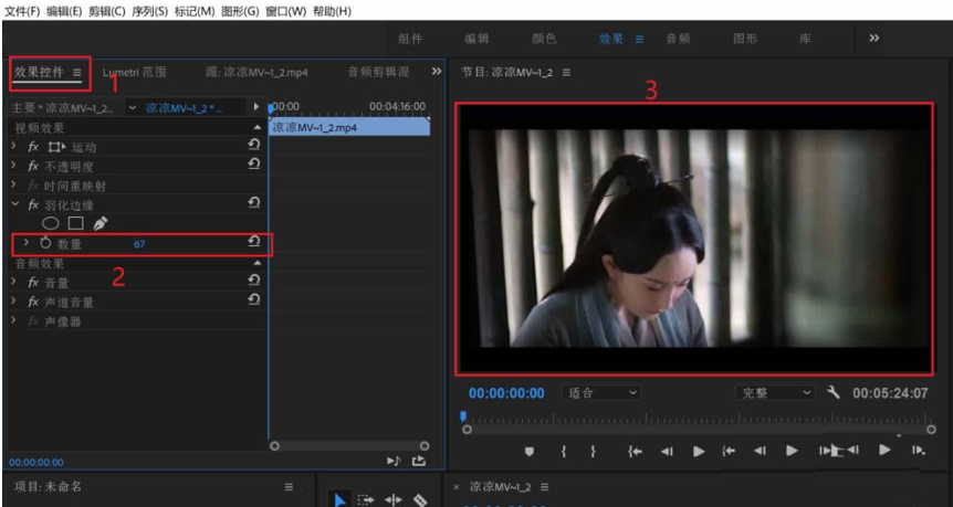 如图,点击左侧的【效果控件】,在下方设置羽化的参数,在右侧预览框中查看更改效果,