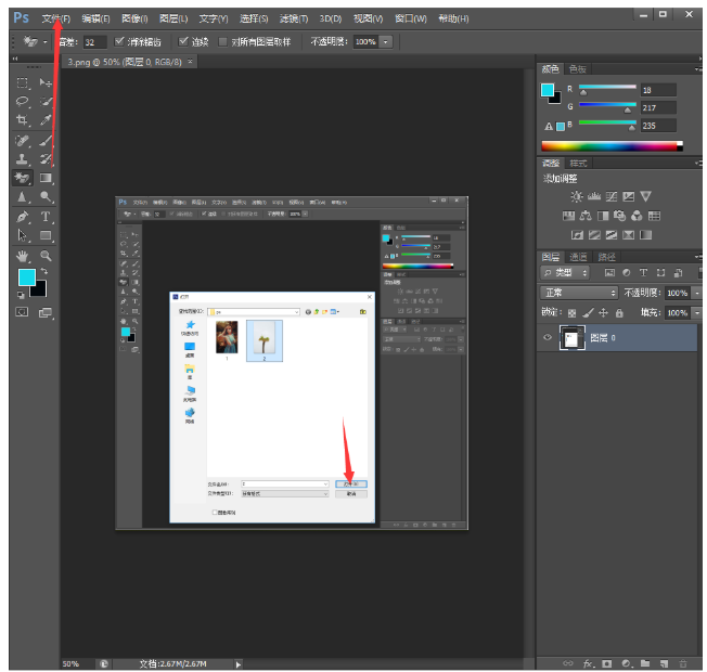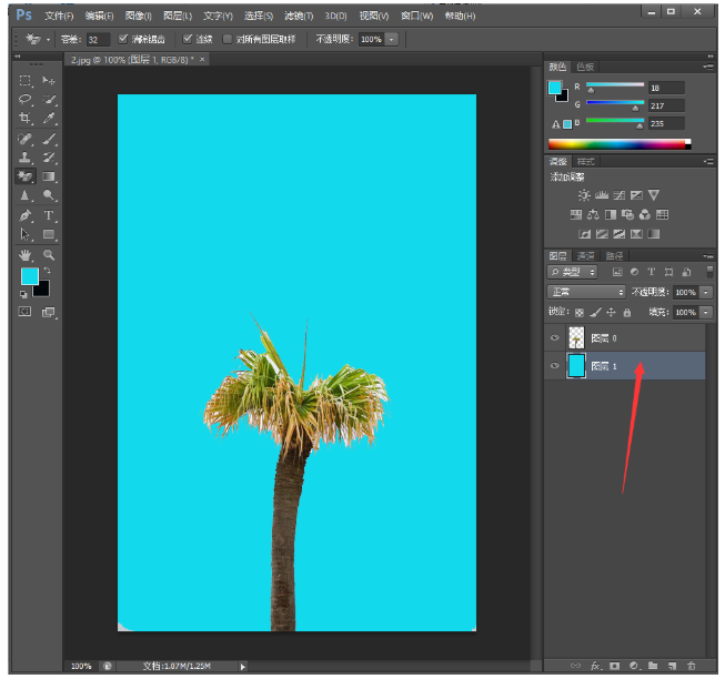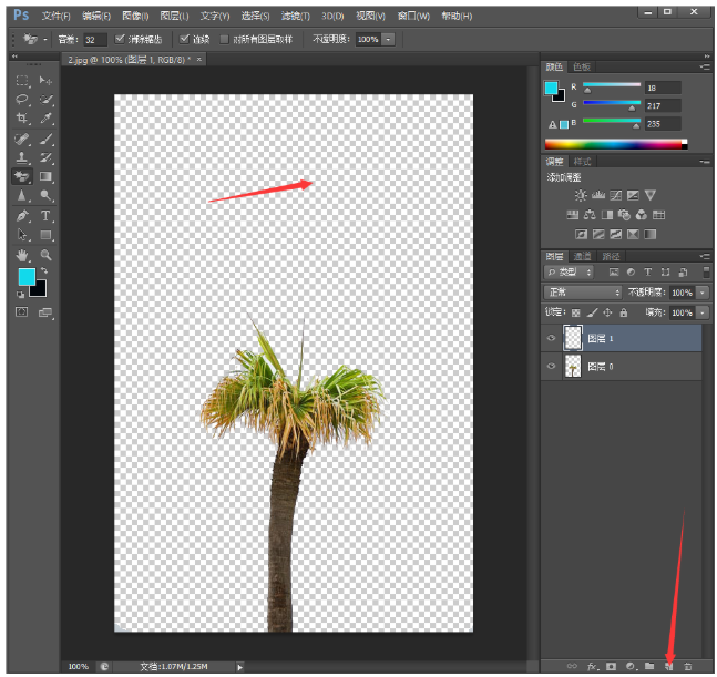 点击图片背景,可以看到背景变为透明状,在右下角点击添加新图层标志,添加一个新图层,