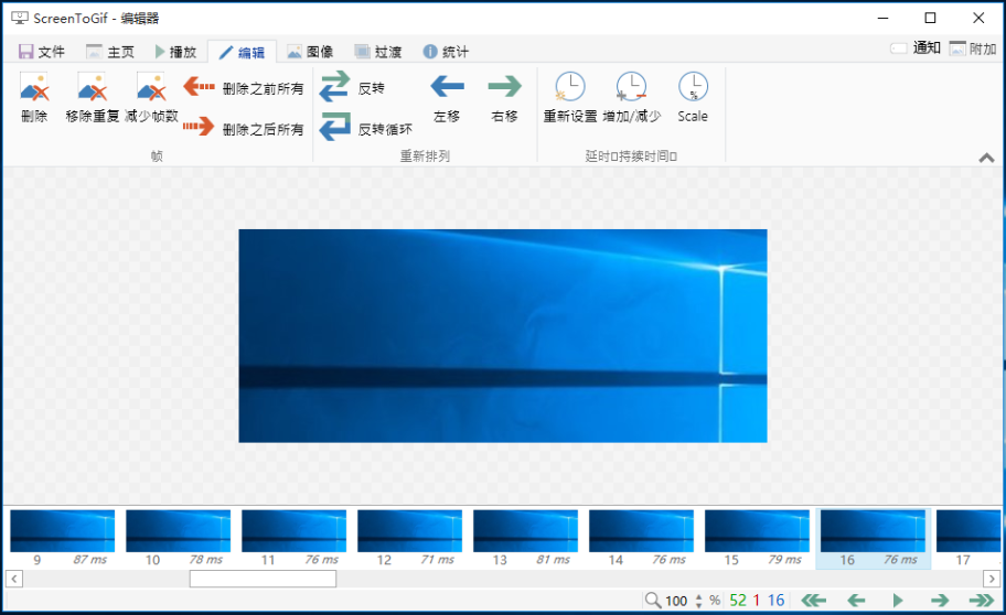 录制屏幕完成,会跳转至ScreenToGif编辑器界面,点击【编辑】,你可以删除整帧、减少帧数、反转循环、左移右移等,特别是移除重复帧,可以减小GIF图片体积,