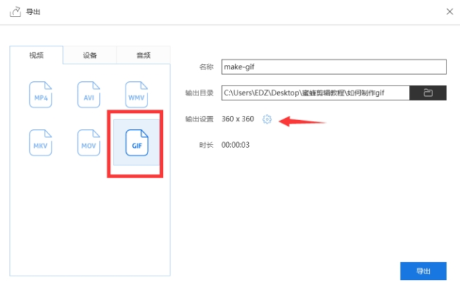 保存文件,选择【导出】,格式选择GIF,填写文件名称和保存路径,分辨率设置为360P或240P就可以了,