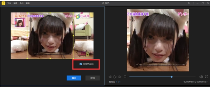 一般的视频文件是16:9的比例,选用1:1比例的时候就会出现黑边,此时选中分割好的片段,点击工具栏上的【裁剪】按钮,勾选【保持宽高比】,将画面裁剪成1:1的比例,