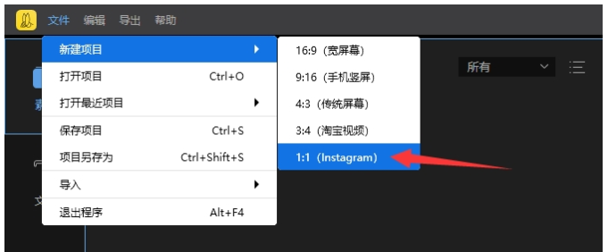 打开蜜蜂剪辑软件,进入主界面,点击上方的【文件】——【新建项目】按钮,选择1:1(Instagram),GIF动图一般是1:1的视频比例,