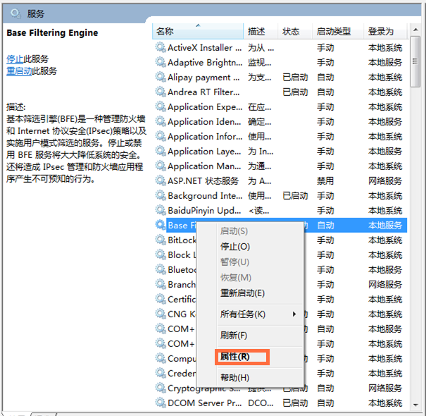 右击【Base Filtering Engine】,弹出菜单,点击【属性】,