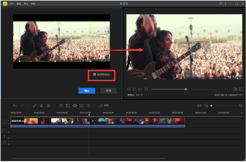 在裁剪窗口中勾选【保持宽高比】,然后缩小黄色边框至预览窗口中不再出现黑边,如图,