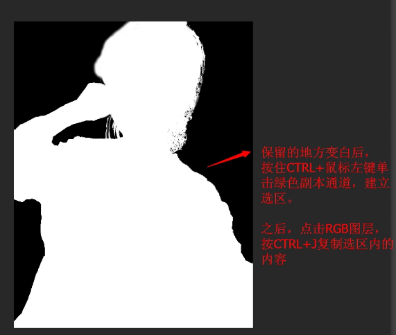 然后用画笔工具把需要清除的地方涂黑,如看不清边缘,点击RGB图层进行选区,再换回绿色通道,用油漆桶涂黑,