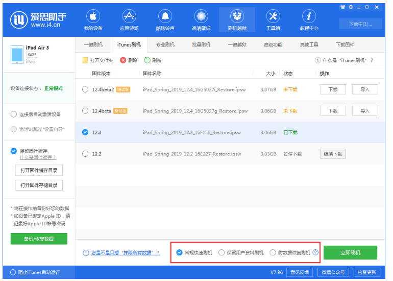 打开爱思助手,点击【刷机越狱】,可以看到新增了【iTunes 刷机】功能,该功能与通过iTunes刷机一样,并将刷机过程完全可视化,在刷机过程中自动修复错误或根据错误代码给出修复建议。